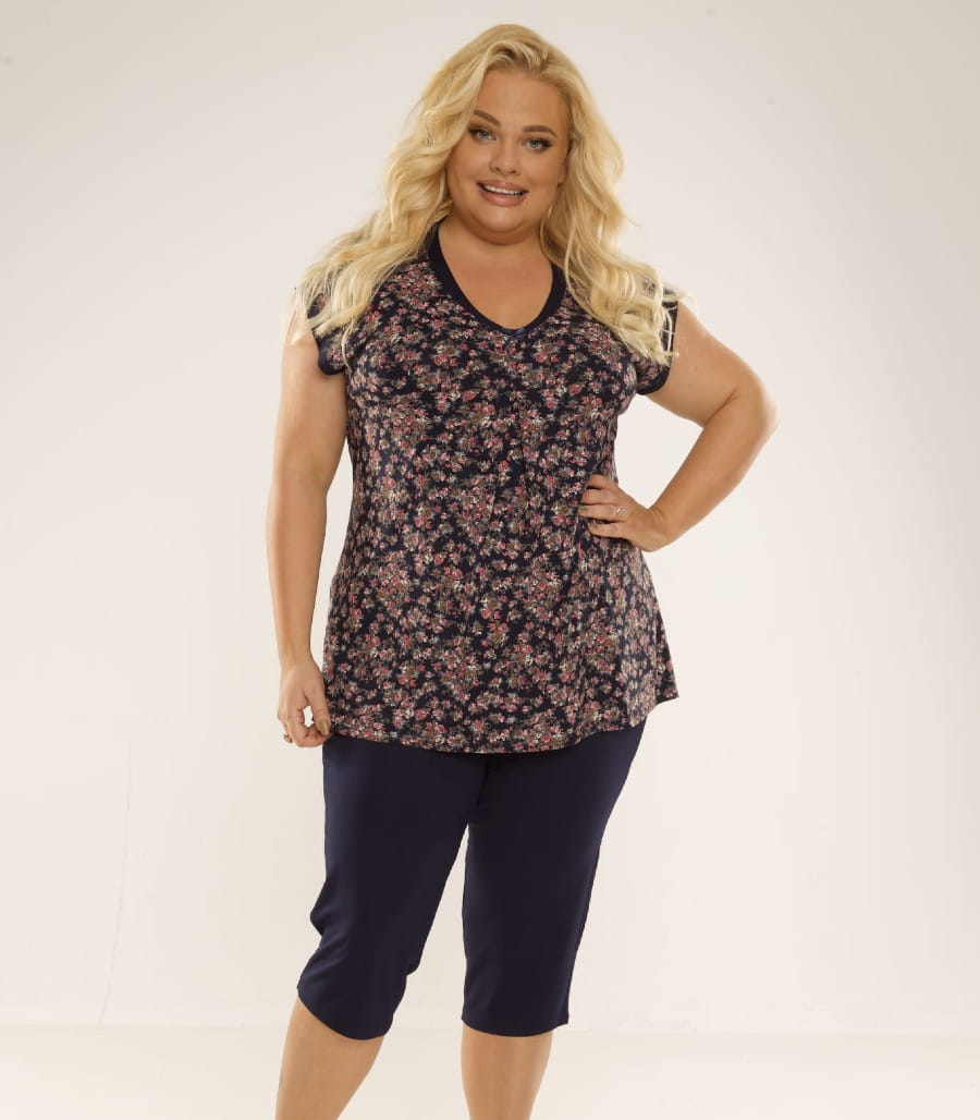 Piżama damska Mia 489/491 od polskiej firmy DeLafense to komfortowy zestaw, składający się z t-shirtu z krótkim rękawem i spodni 3/4, idealny na relaksujące wieczory oraz spokojny sen. Ozdobiona delikatnym kwiatowym wzorem, piżama łączy w sobie elegancję i wygodę, co czyni ją świetnym wyborem dla każdej kobiety.