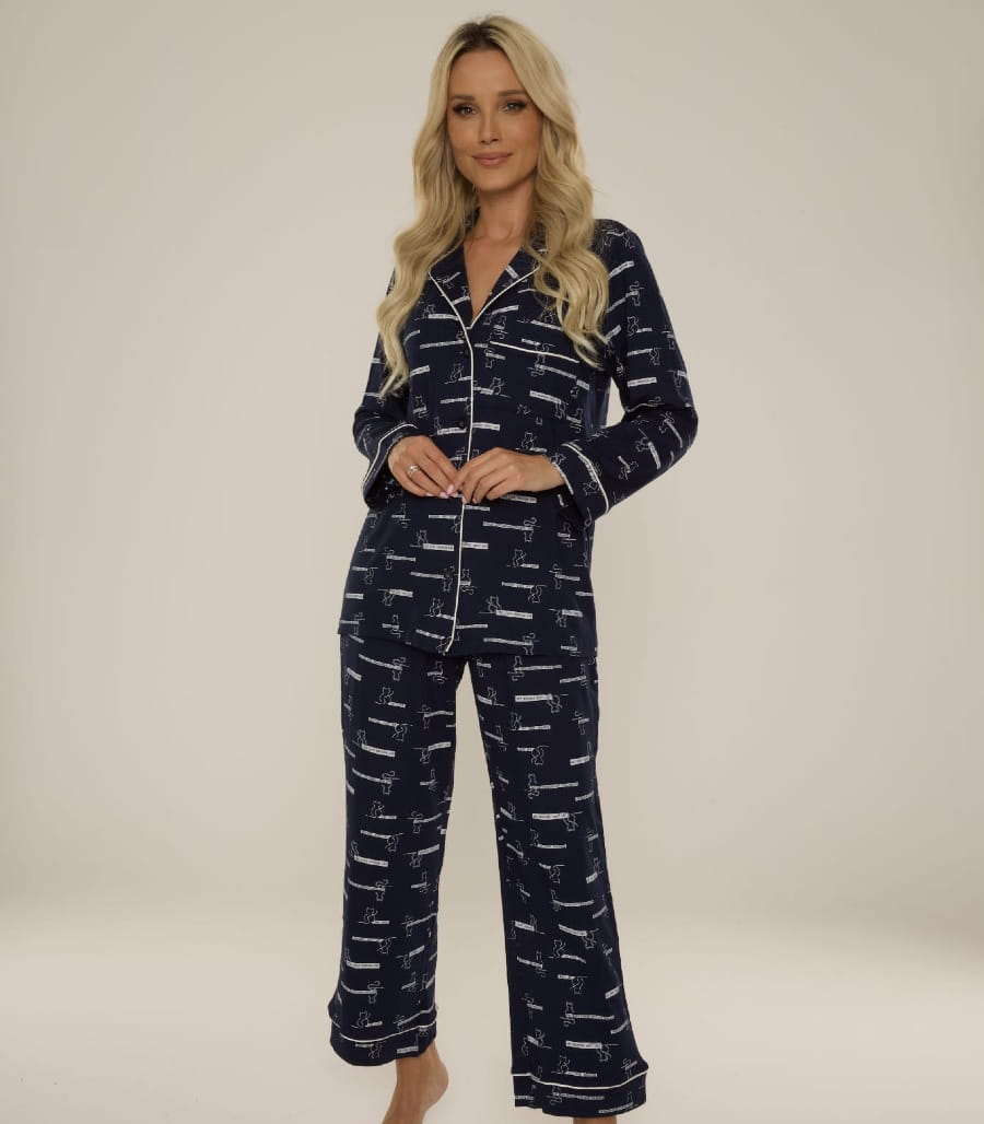 Piżama damska Madeleine 718 od polskiej firmy DeLafense to elegancki, dwuczęściowy komplet zapinany na guziki, składający się z koszuli z długim rękawem oraz długich spodni, który łączy klasyczny fason z nowoczesnym wzornictwem.