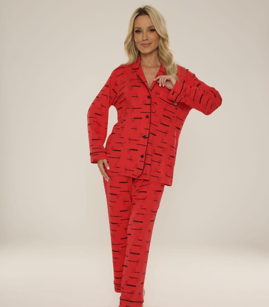 Dostępna w modnych kolorach granat i czerwony, z delikatnym printem w kotki, w rozmiarach S-XXL, piżama Madeleine 718 sprawdzi się zarówno jako wygodny strój do snu, jak i stylowy komplet do domowego relaksu - wybierz swój rozmiar i poczuj komfort DeLafense.