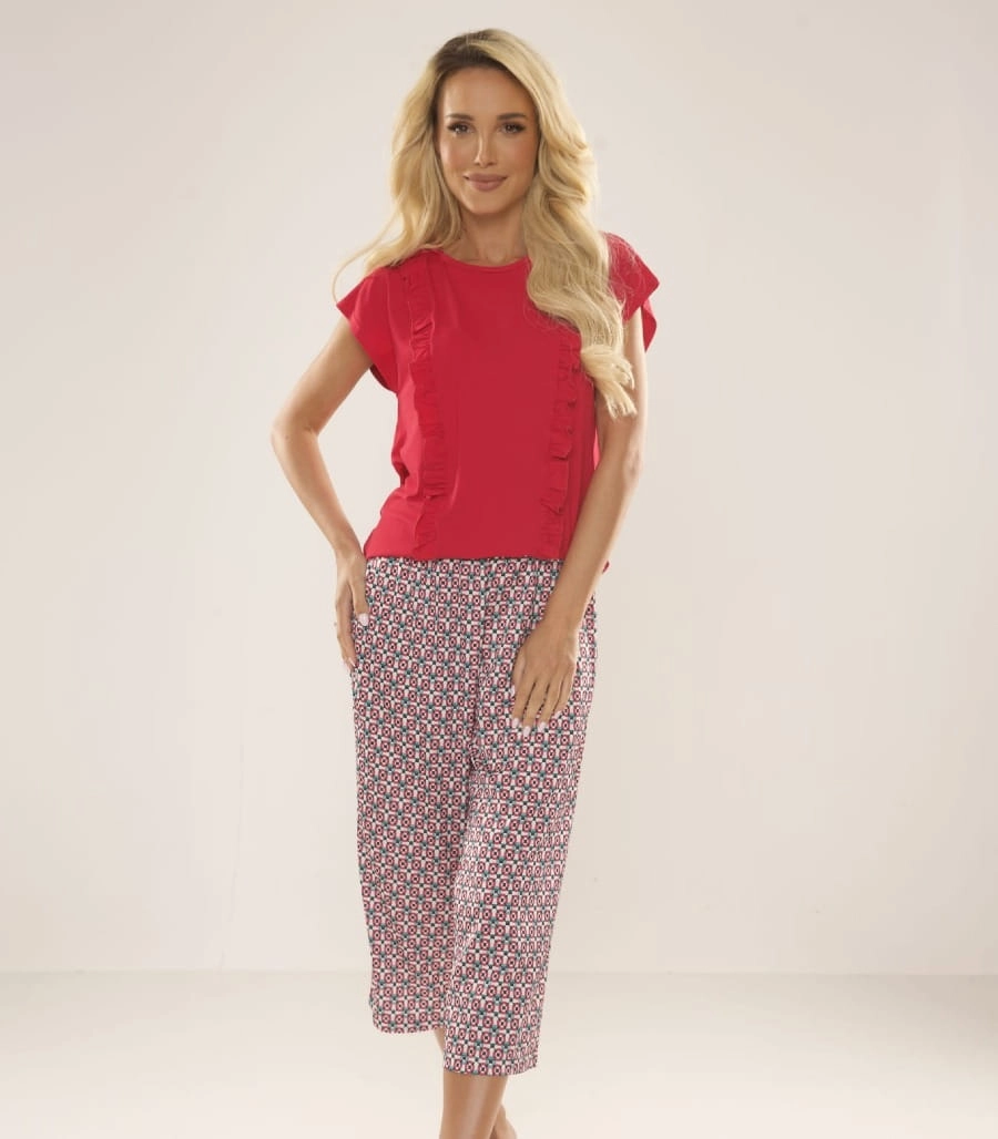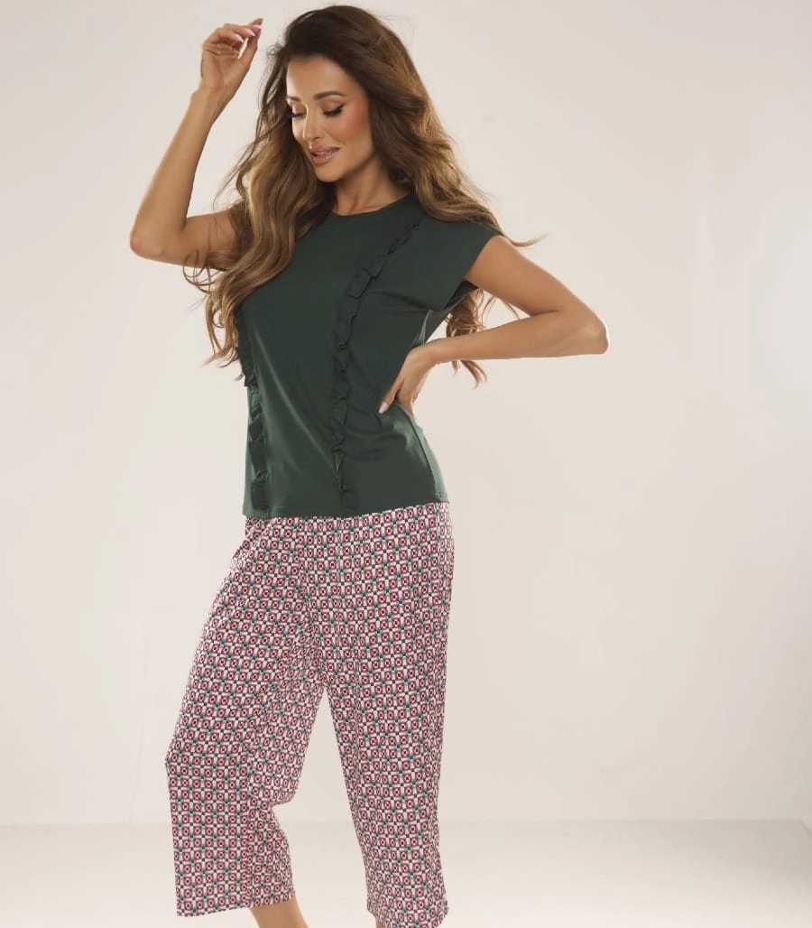 Subtelne falbankowe zdobienia po bokach topu dodają całości kobiecego charakteru, a wzorzyste kuloty w długości 7/8 tworzą modny, świeży kontrast, dzięki czemu komplet świetnie sprawdzi się zarówno do domowego relaksu, jak jako piżama. Model dostępny jest w eleganckich wariantach kolorystycznych (ciemna zieleń i energetyczna czerwień) oraz w rozmiarach S-XXL, co ułatwia dopasowanie do różnych sylwetek.