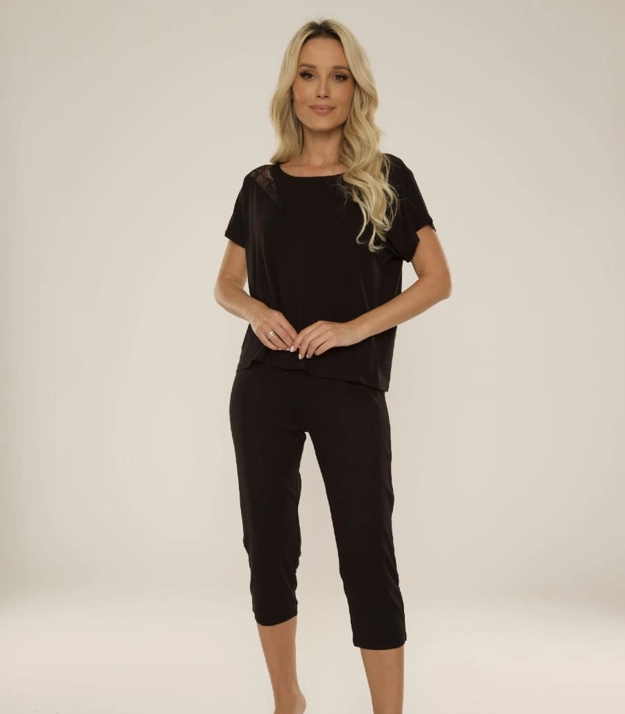 Piżama damska Velar 740 od polskiej firmy DeLafense to komfortowy zestaw składający się z t-shirtu z krótkim rękawem oraz spodni 3/4, idealny na relaksujące wieczory i spokojny sen. Luźny krój oraz delikatne koronkowe wykończenie na ramionach dodają elegancji i sprawiają, że piżama jest doskonałym wyborem na cieplejsze noce.