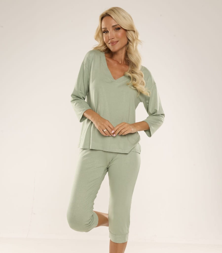 Komplet damski Freya 725 od polskiej firmy DeLafense to elegancki zestaw składający się z bluzki z rękawem 3/4 oraz dopasowanych spodni o długości 3/4, wykonany z miękkiej i elastycznej mieszanki 94% wiskoza i 6% elastan. Materiał lekko układa się na ciele, zapewniając przewiewność oraz pełen komfort noszenia przez cały dzień i noc.