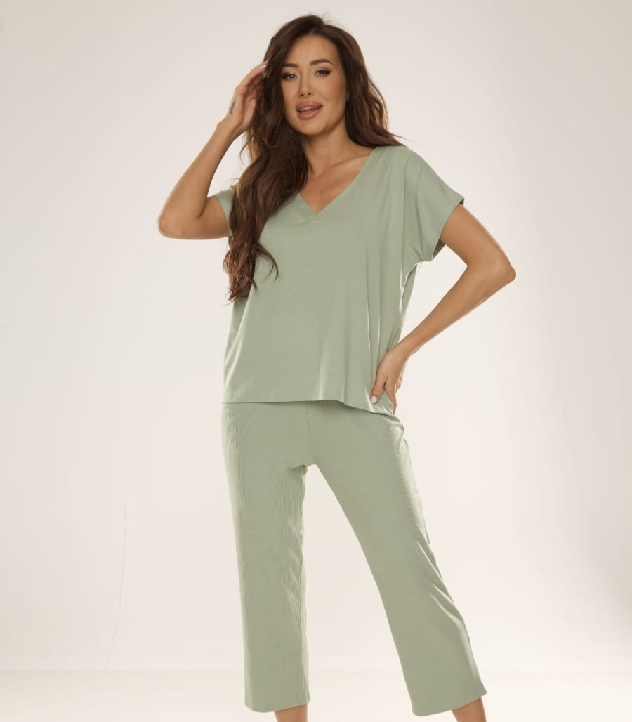Wiskozowa piżama damska Freya 694 od polskiej firmy DeLafense to wygodny zestaw, składający się z t-shirtu z krótkim rękawem oraz spodni 3/4, idealny na relaksujące wieczory oraz komfortowy sen. Jego luźny krój oraz dekolt w kształcie litery V zapewniają nie tylko wygodę, ale także lekkość i swobodę ruchu.