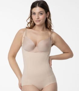 Wykonane z delikatnego, oddychającego materiału, body doskonale dopasowuje się do sylwetki, co zwiększa komfort noszenia przez cały dzień. Specjalne panele materiałowe tworzą elastyczne strefy wyszczuplenia, które efektywnie spłaszczają brzuch, wysmuklają talię oraz unoszą pośladki, a także podnoszą piersi, zapewniając atrakcyjny kształt.