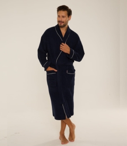 Model LAURENT to szlafrok męski długi, wykonany z wysokiej jakości materiału: 80% bawełna, 20% poliamid, co zapewnia trwałość, przewiewność oraz komfort noszenia. Dostępny w klasycznym kolorze granatowym, idealnie wpisuje się w gust mężczyzn preferujących stonowaną elegancję. Wybierz szlafrok męski długi LAURENT i ciesz się wygodą każdego dnia.
