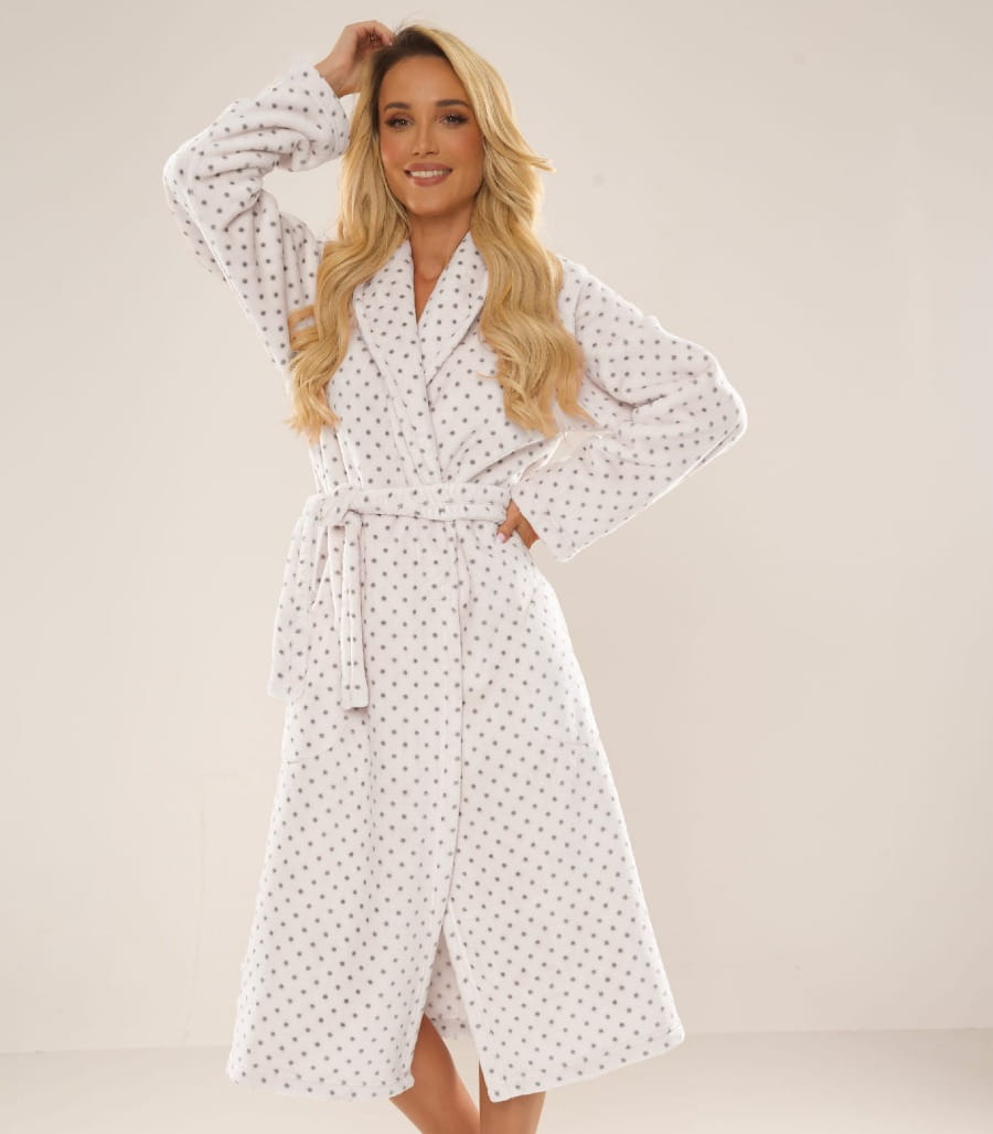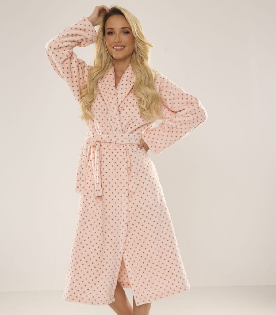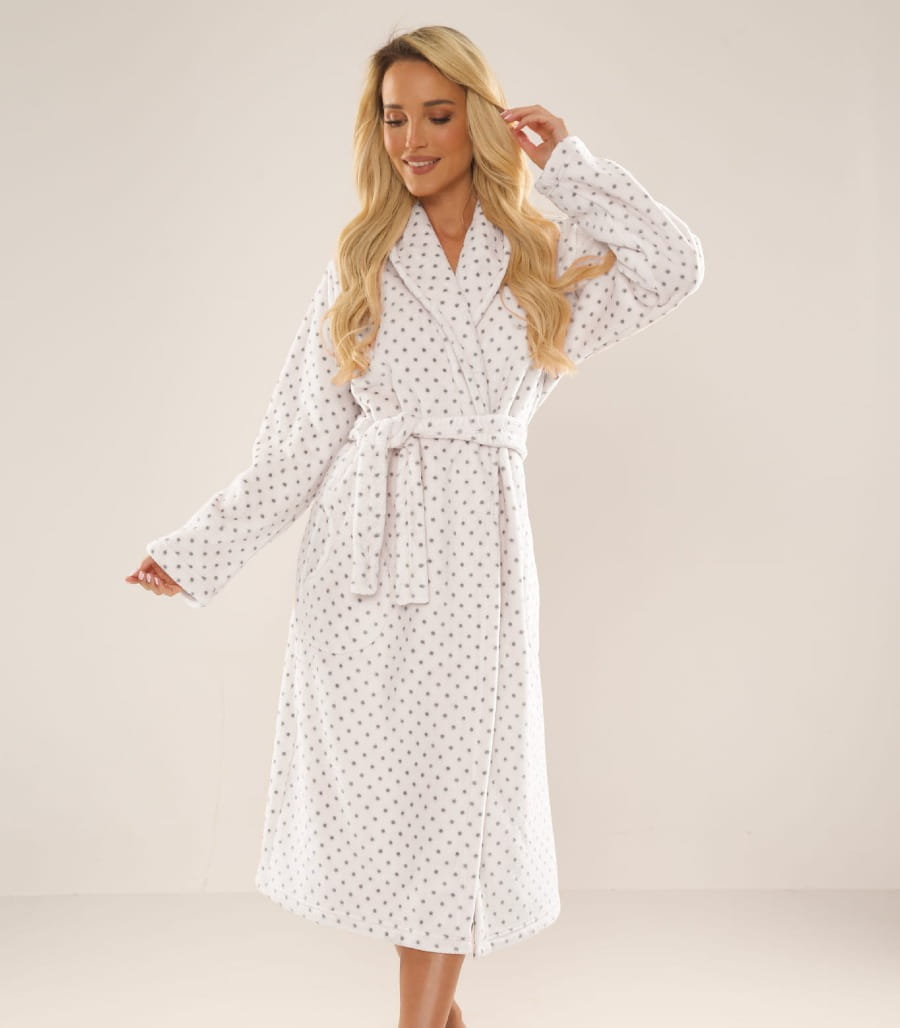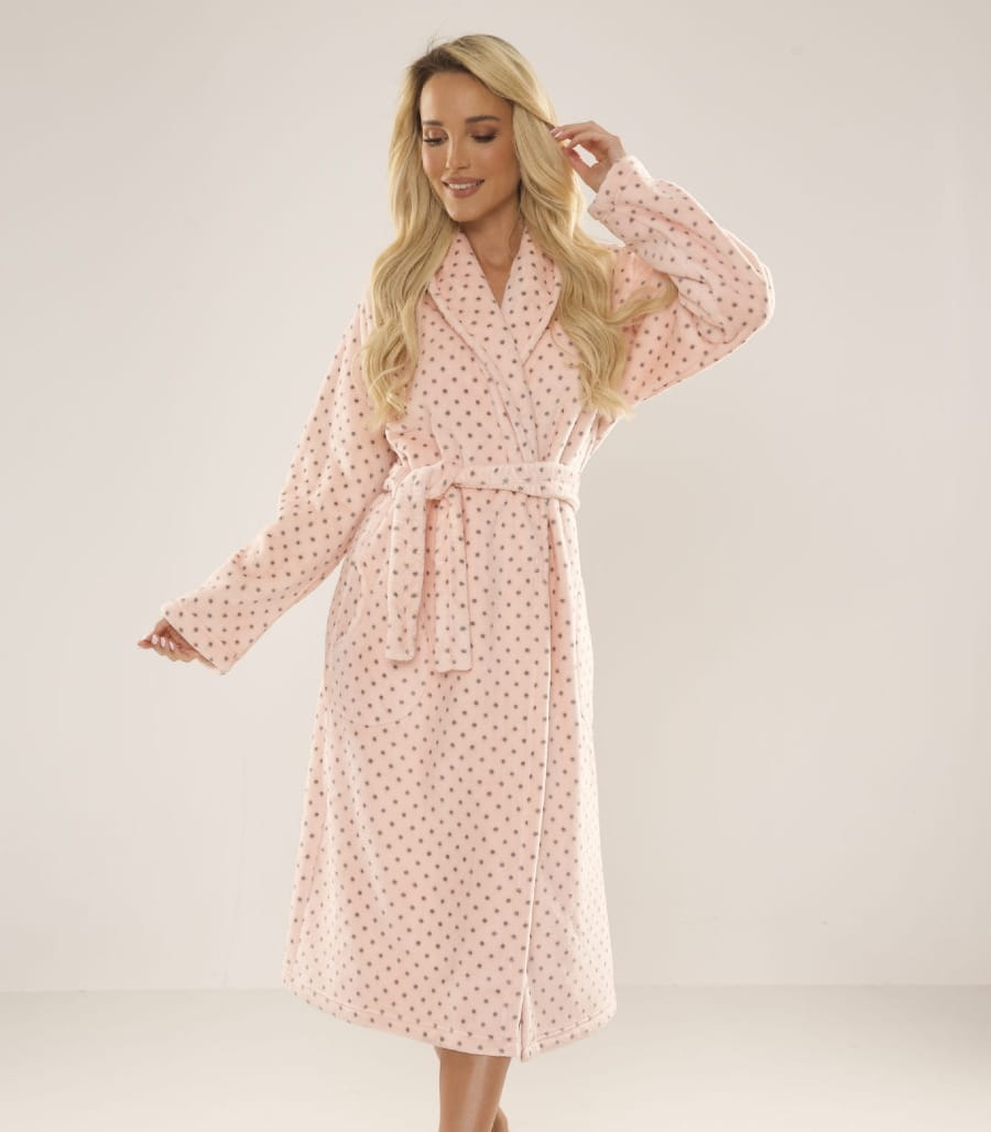 Model posiada długi fason z kołnierzem, praktyczne kieszenie oraz wiązanie w pasie, które umożliwia dopasowanie szlafroka do sylwetki. Delikatny wzór w drobne kropki nadaje całości modnego charakteru i sprawia, że szlafrok prezentuje się niezwykle stylowo i kobieco.