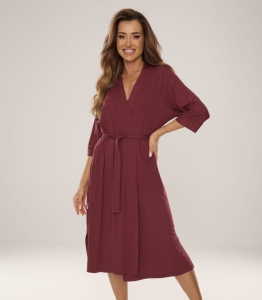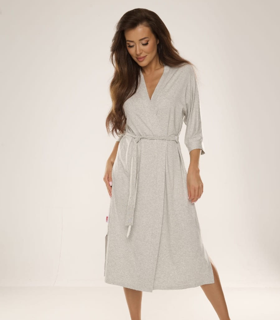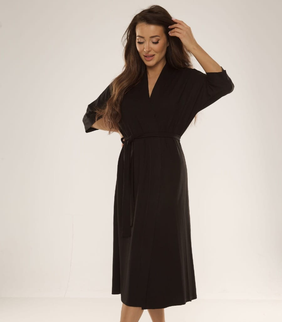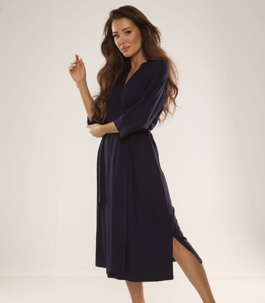Długi szlafrok Visa 942 od polskiej firmy DeLafense to elegancki model z miękko układającej się tkaniny, który pięknie otula sylwetkę i idealnie sprawdza się do codziennego relaksu w domu. Długość za kolano oraz klasyczny fason nadają mu ponadczasowego charakteru, a wiązanie w pasie subtelnie podkreśla talię.