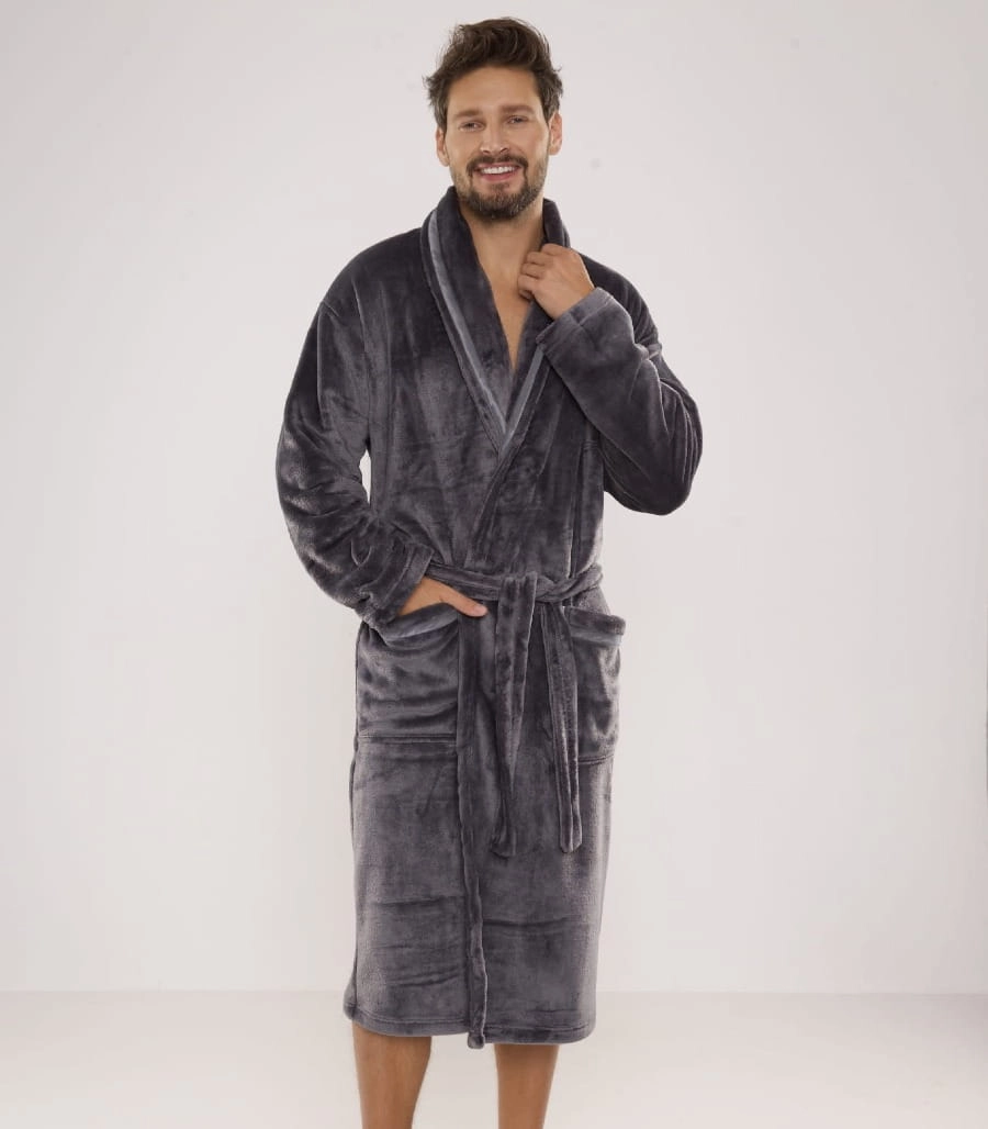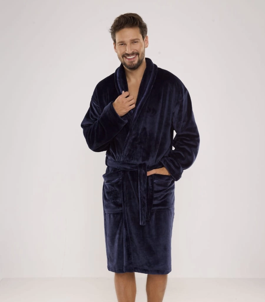 Szlafrok posiada praktyczny pasek w talii oraz pojemne kieszenie, które dodają mu funkcjonalności. Dostępny jest w dwóch klasycznych kolorach: granatowym i grafitowym, oraz w rozmiarach M, L, XL, XXL, co sprawia, że pasuje do różnych sylwetek.