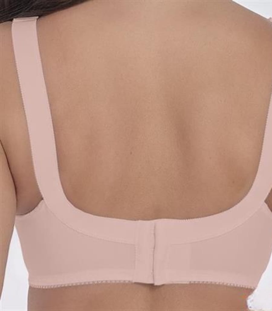 Wysoki środek świetnie trzyma i modeluje biust, zapobiegając zsuwaniu się nawet dużych piersi. Zapięcie na trzy haftki o szerokości 65 mm z trzystopniową regulacją gwarantuje dopasowanie i wygodę. Ramiączka nieodpinane, z możliwością regulacji z przodu.