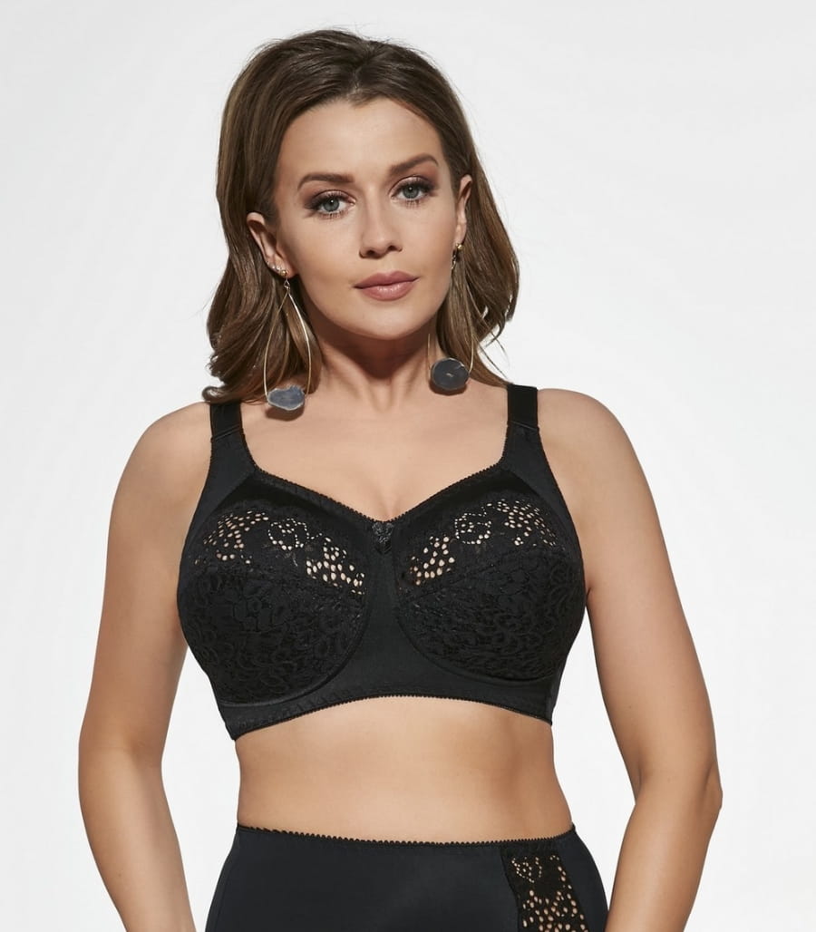 Biustonosz Krystyna 579 typu soft to miękki, wygodny biustonosz bez fiszbin, stworzony z myślą o kobietach ceniących elegancję i komfort. Dzięki oryginalnej konstrukcji, zapewnia doskonałe modelowanie i stabilność biustu, zwłaszcza u Pań z dużym biustem.