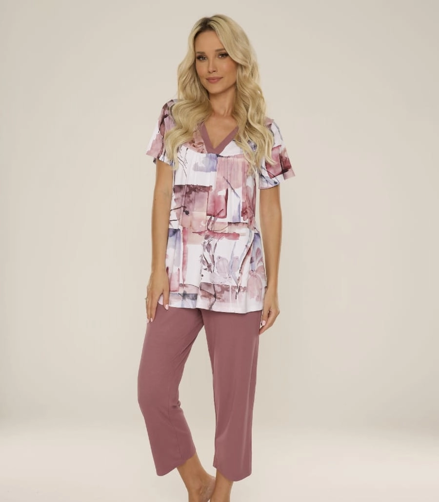 Piżama składa się z bluzki z krótkim rękawem oraz spodni o długości 3/4, które gwarantują lekkość i komfort noszenia. Efektowny, artystyczny wzór w odcieniach różu i fioletu nadaje kompletowi modnego charakteru i sprawia, że całość prezentuje się bardzo kobieco.