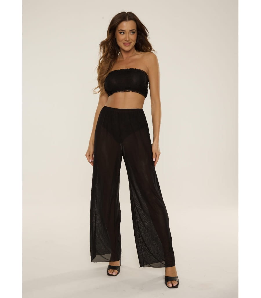 Model posiada długi, szeroki fason z lekkiej siateczkowej tkaniny, który pięknie układa się na sylwetce i zapewnia swobodę ruchów. Transparentny materiał oraz nowoczesny krój nadają spodniom modnego charakteru i sprawiają, że idealnie komponują się z kostiumem kąpielowym lub letnim topem.