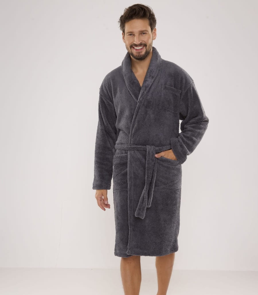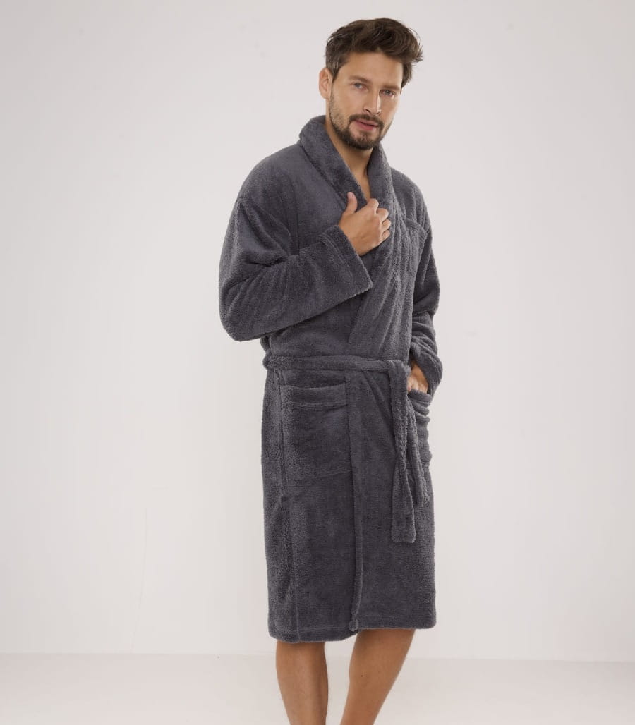 Model posiada klasyczny fason z eleganckim kołnierzem oraz wiązaniem w pasie, które umożliwia dopasowanie szlafroka do sylwetki. Praktyczne kieszenie na biodrach oraz puszysta, grubsza tkanina nadają szlafrokowi modnego charakteru i sprawiają, że świetnie sprawdzi się podczas porannego relaksu lub wieczornego odpoczynku.