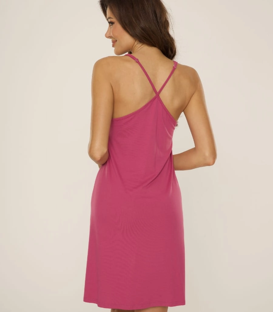 Elegancka koszula nocna CARMEL 765 polskiej firmy DeLafense to propozycja dla kobiet ceniących komfort i subtelną zmysłowość. Wykonana z wiskozy z domieszką elastanu, jest miękka, oddychająca i przyjemna dla skóry.