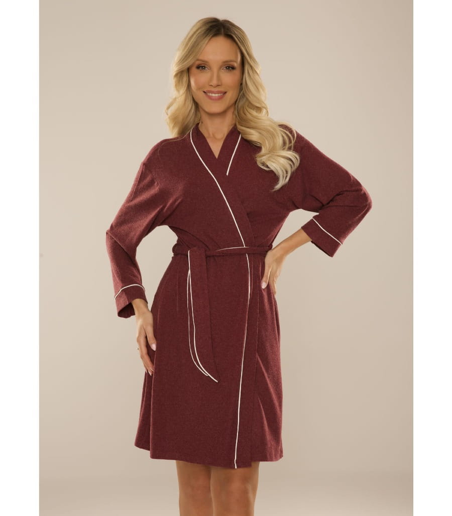 Szlafrok posiada klasyczny fason z kołnierzem oraz wiązaniem w pasie, które pozwala dopasować go do sylwetki i zapewnia wygodę podczas codziennego użytkowania. Dekoracyjna lamówka przy kołnierzu i rękawach nadaje całości modnego charakteru i podkreśla elegancki styl modelu.